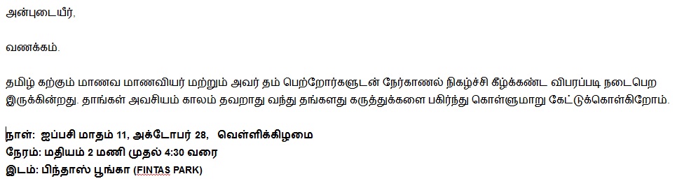 Tamil Class Interactive Meet withTamil Learners and Their Parents on 28 October 2011 Posted by Vishalvalli-Chettinad Cookbook on October 22, 2011October 22, 2011 Share this: Chettinadcookbook.org Click to share on X (Opens in new window) X More Click to share on Facebook (Opens in new window) Facebook Click to share on Telegram (Opens in new window) Telegram Click to share on WhatsApp (Opens in new window) WhatsApp Click to email a link to a friend (Opens in new window) Email Like Loading... Related
