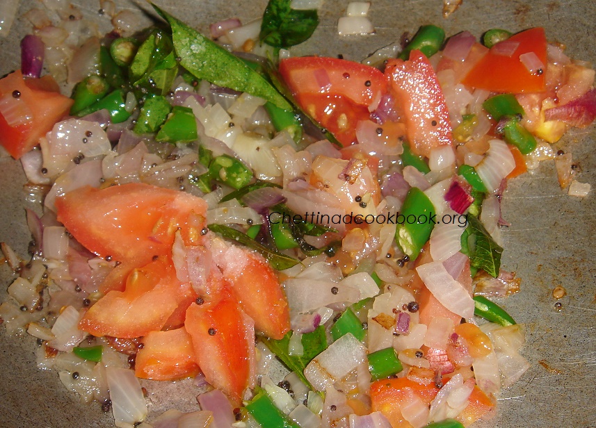 3.Now Heat pan with 2tsp of oil add mustard seeds and urad dal, let it splatter add chopped Onion, Green chilli, Curry leaves and Red chilli, finally add Tomato saute for a while