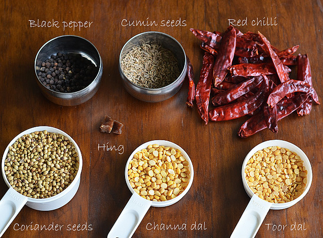 In a kadai – dry roast toor dal along with red chillies until golden brown,Set aside. Then add coriander seeds and roast till nice aroma comes,set aside.