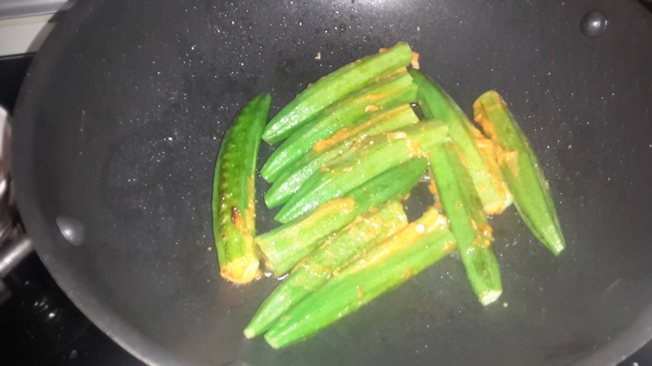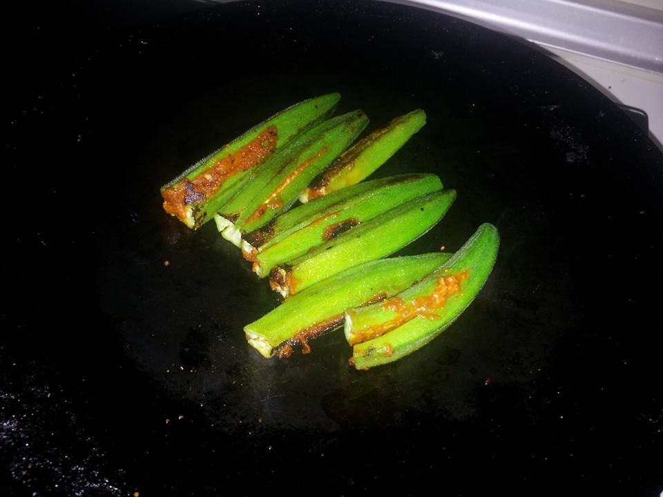 Stuff 1/4 tsp of mixed paste inside every ladies finger close by pressing the slit edges.