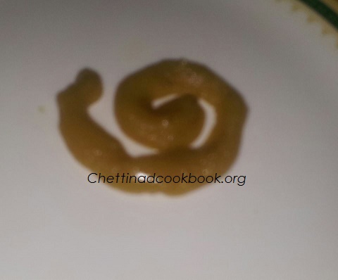 4. Check the syrup by dropping little of it in water if it does not dissolve and remains the same in water without any change, that is the right time to add rice flour.(this is otherwise called as Kampi paagu padham in Tamil conforming pearl stage of it). String consistency.
