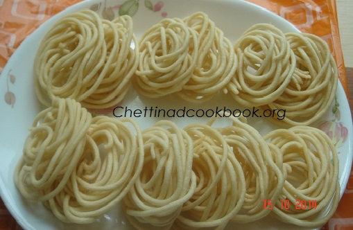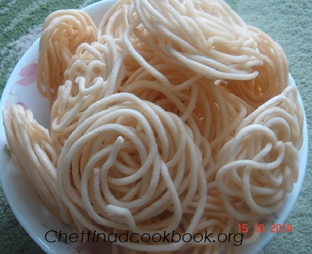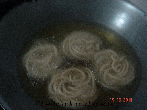 3. Heat oil in a wide pan, fill batter in the Thenkuzhal press, placing five holed plate in the press, press three round as circle in hot oil, Can do 3 or 4 at a time.