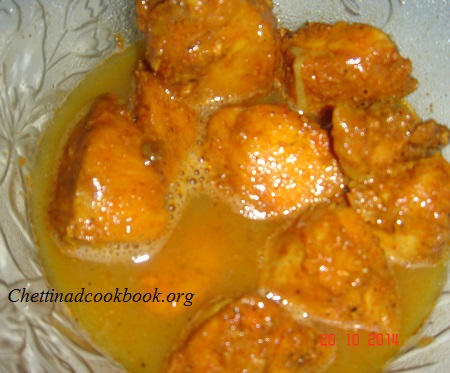 In a kadai add chicken, salt, chili powder, ginger garlic paste, and turmeric powder. Add 1/2 cup of water and cook in medium flame, until water evaporates completely.3/4th cooked is fine.