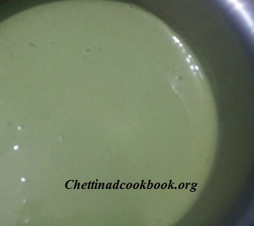 3.Grind rice, dal and fenugreek seeds to a smooth paste adding little water as we grind for Dosa or Idli. The consistency should be that of dosa batter consistency. Add the mudakathan leaves also in the end and grind it to a smooth paste. The batter will be in a lovely light green colour.