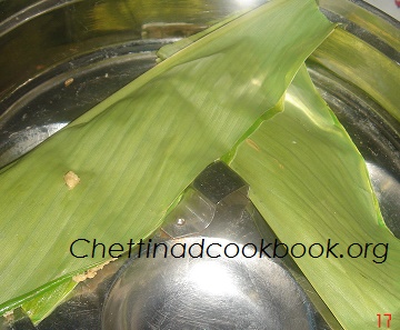 Place it on the square cut Banana leaf or turmeric leaf, you can grease the leaf if you prefer before placing the mixture on the leaf. Fold it and steam cook in Idly pot for 10 minutes. (I have used Turmeric leaves)
