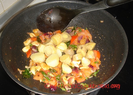 5.Add sambar masala powder and Tamarind juice to it,add 1 1/2 cup of water and allow it to boil for 15 minutes,so that the kilangu absorbs tamarind juice and masala added in it.If you prefer more gravy grind 1/2 onion and 1 tomato mix along with this gravy to boil.