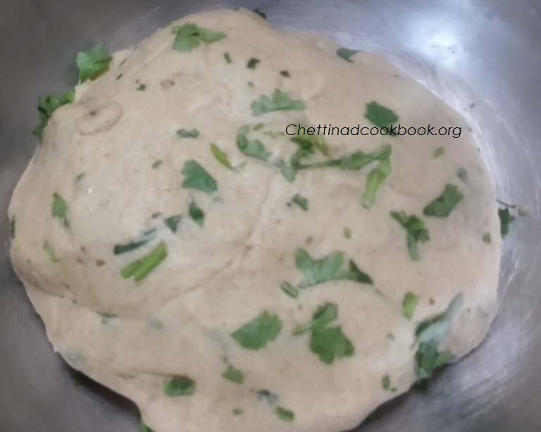 In a wide bowl put all ingredients and mix well,add water little at a time mix all together to make a soft dough.