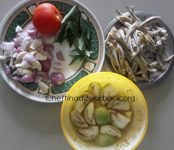 2.Cut onion,brinjal, tomato,and garlic.