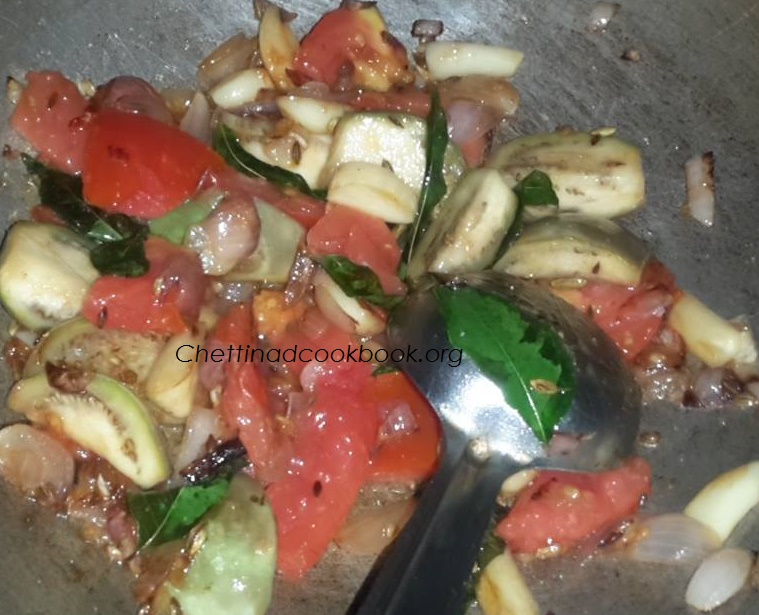 4.Add cut Onion and Garlic saute for a while, add Curry leaves,salt,brinjal and tomato saute until tomato leaves its skin.