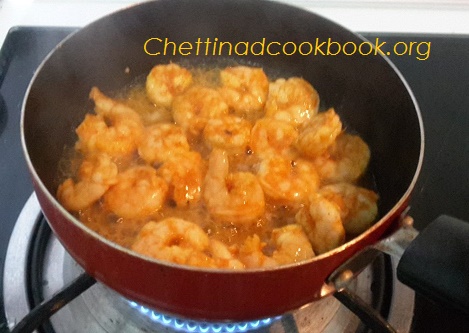 Heat pan with 1 tbsp of oil and saute marinated shrimps for 3 minutes,keep it ready.