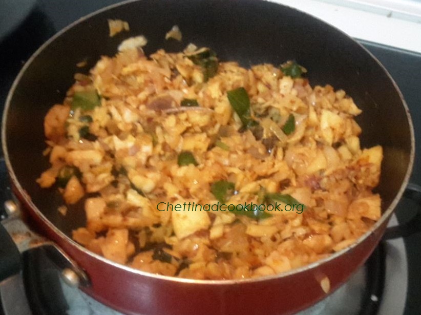 Add curry leaves ,chilli powder,salt and crumbled fish stir well cook in low flame for 5 to 8 minutes until it gets slightly brown.