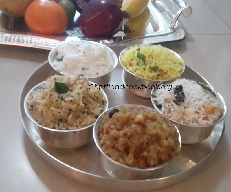 Neivedhyam – ‘Cithrannam’, Lemon rice, Curd rice, Mango rice,Chakkara pongal and Coconut rice are prepared on this day with tender coconut juice, buttermilk and panakkam as prasadam for god.