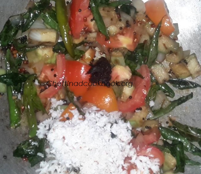 2.Heat wok season it with the above “To temper” ingredients, add curry leaves and cut brinjal, saute for a while, add onion and green chilli cook in medium flame for about 5 minutes or until brinjal gets soft.