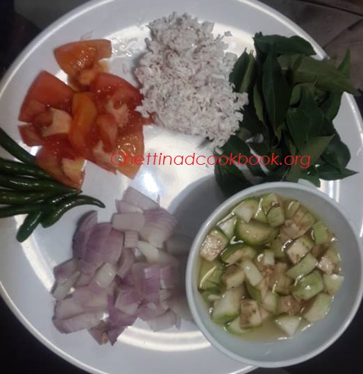 Take 2 or 3 brinjals cut in to small cubes,cut onion and tomato.