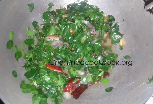 3. Add chopped shallots saute for a while, add greens to it.
