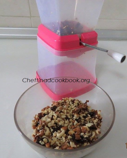 Take a wide pan thick bottom, add 1 tsp of ghee and brown roast all nuts. Roast coconut till it looses its moisture.