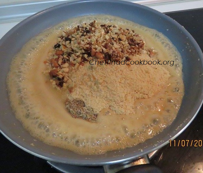 Heat pan again and add milkmaid, roasted rava , nuts and 1 tbsp of coconut, stir it well in medium flame till it becomes thick to make balls.
