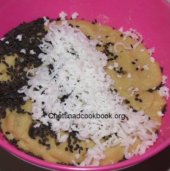 Now add grated coconut, urad dal flour, cardamom powder and sesame seeds to it mix well all together.