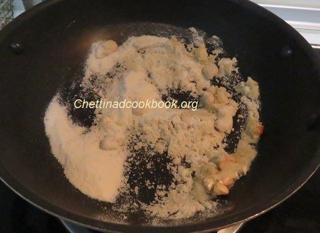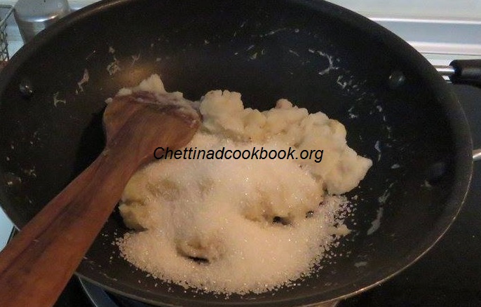 When it gets cooked add the sugar and stir it well, gradually it will leave its sides of the pan.