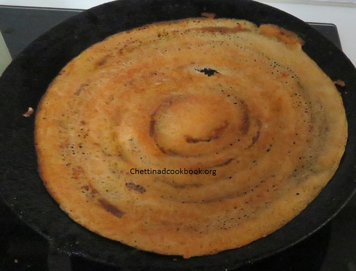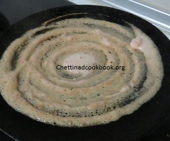 4.Heat dosa pan, take a ladle full of batter and spread it to a thin dosa.