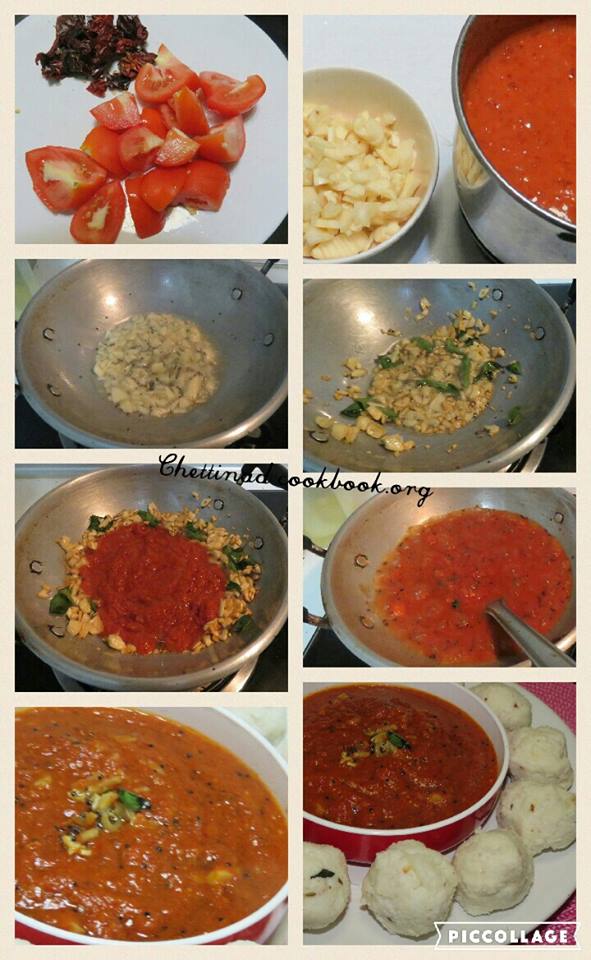 3. Grind tomato, soaked red chilli and salt to a smooth puree.
