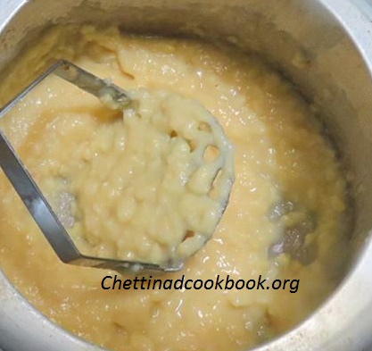 1.Dry roast moong dal to golden yellow, pressure cook to a smooth consistency.