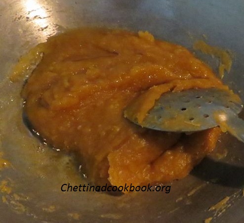 7. Stir continuously until the halwa leaves its sides of the pan, time to remove from flame.