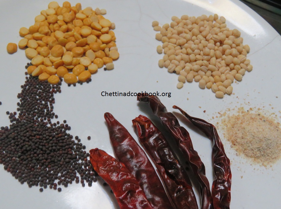 1. Heat pan with two teaspoons of oil, add channa dal first, in a sec add urad dal and other ingredients from the set -1, fry golden yellow.