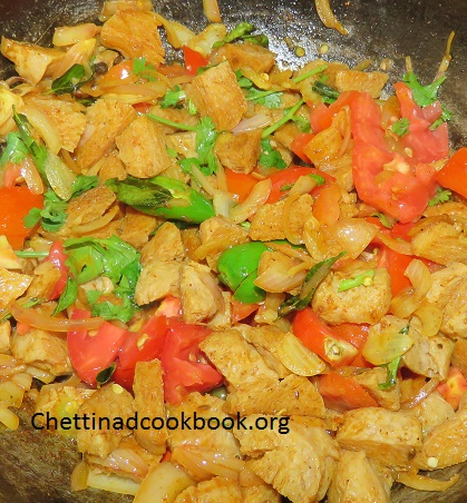 6. Add cut onion, tomato, and green chillies fry for 3 minutes, add soya chunks.