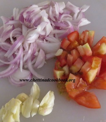 Peel and cut onion lengthwise, tomato into small pieces and make garlic cloves crushed.