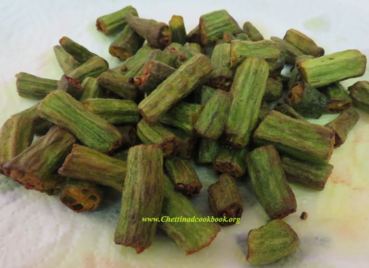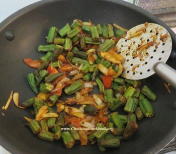 Heat oil in a wide pan shallow fry prepared ladies finger to golden yellow.