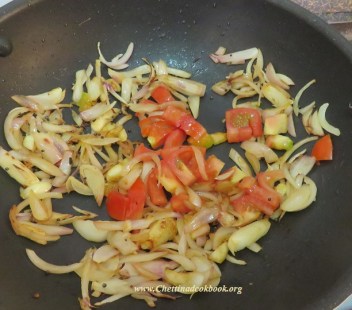 Time to add tomato, salt, sugar and chili powder, saute till tomato leaves its skin.