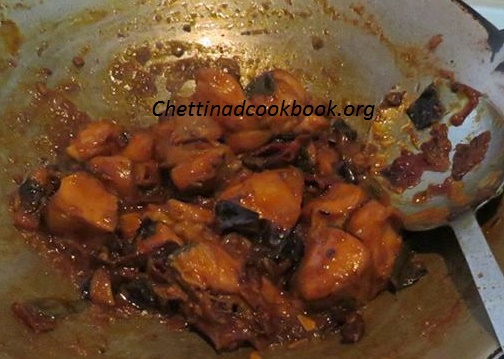 Step-5: Cook until the water evaporates, such that masala gets coated and chicken becomes soft.