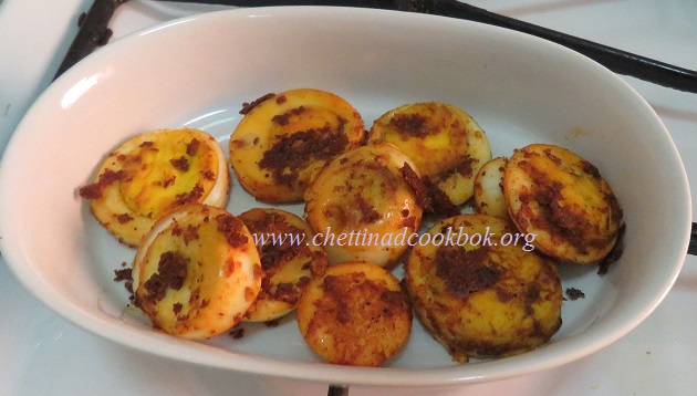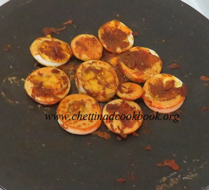4. Place the boiled egg slices on the pan such that masala sticks to the egg on cooking, allow it to get roasted for 3 minutes in low flame.