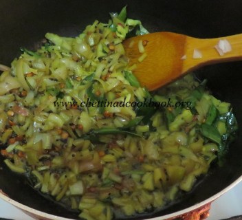 Add chopped onion, curry leaves, and green chili stir till it gets translucent.