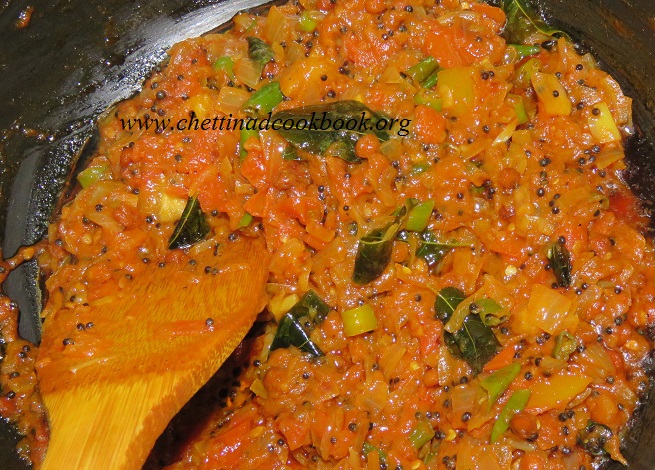 Add chopped tomato, (chopped few capsicums can be added if preferred for attractive color combination)saute for few minutes till it leaves its skin.