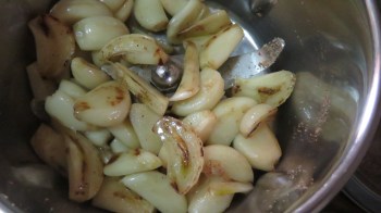 Take a thick bottom pan, add a teaspoon of oil and roast garlic until half cooked slightly golden yellow.