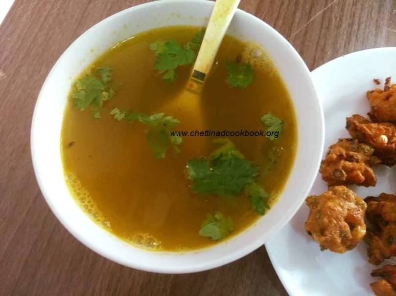 Yummy Herb clear soup is ready to serve with some vegetable fritters.