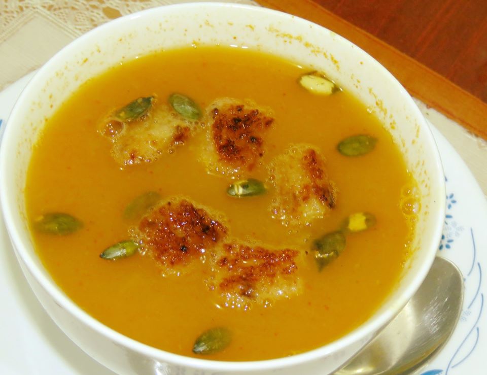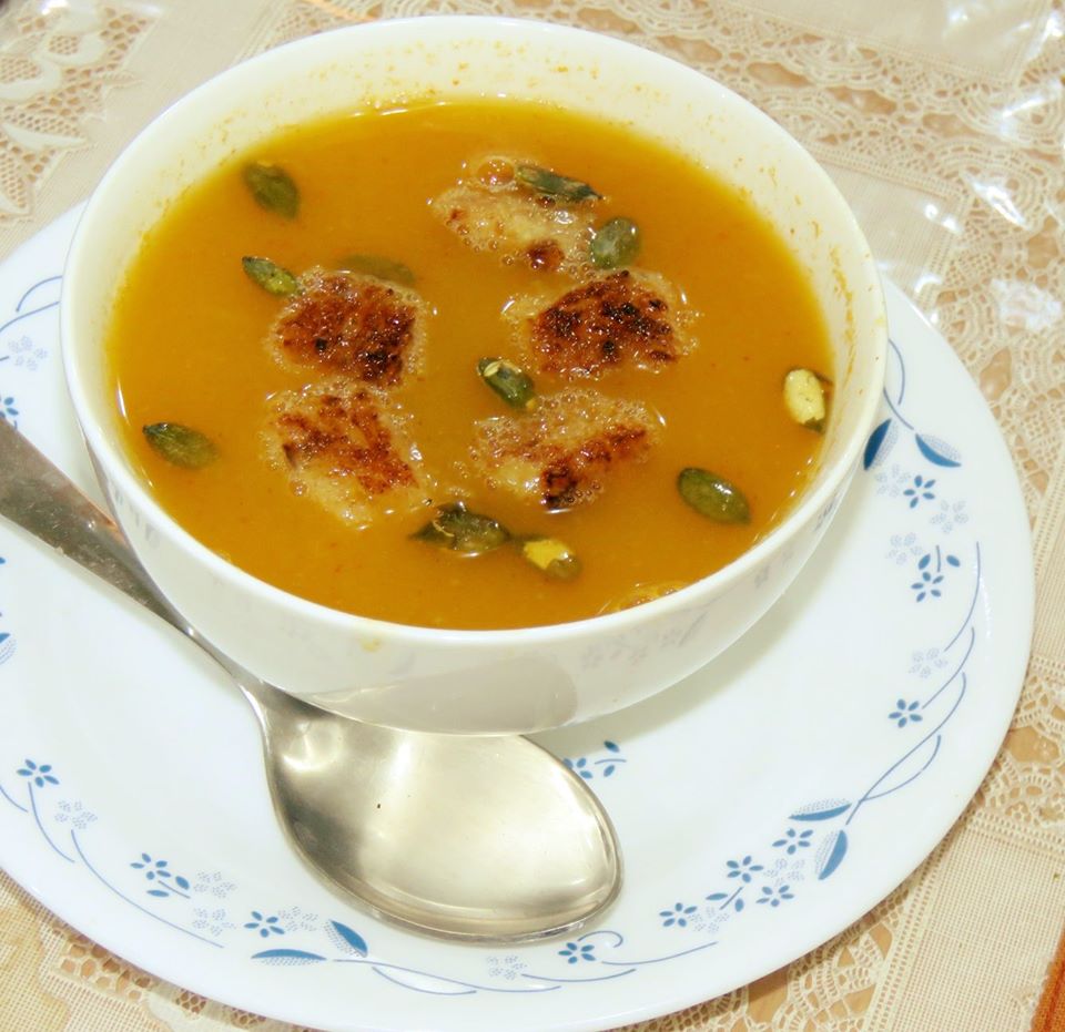 Serve warm with the roasted bread pieces and pumpkin seeds and pepper powder. which makes you heavenly delight.