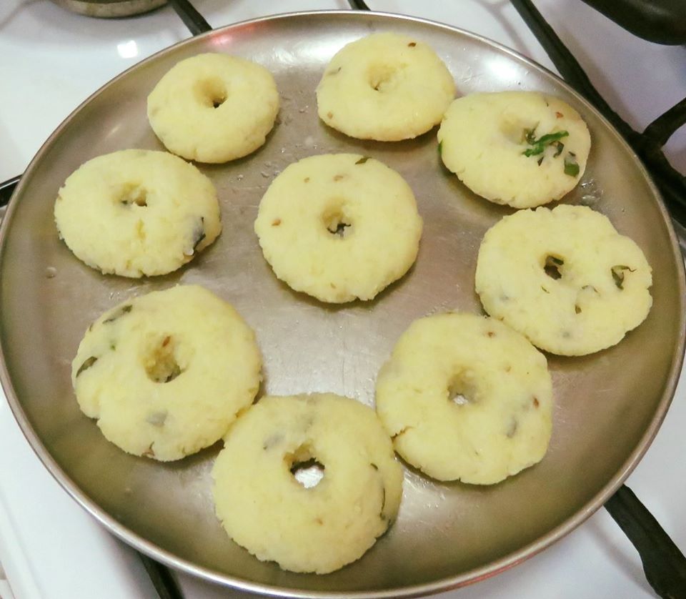Grease your hands, divide the mixture into equal-sized balls take a ball place in between your greased palms, and press slightly make a whole in the middle.
