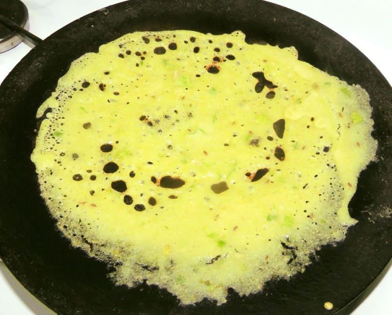 Heat Iron Tawa, pour the batter from the outer circle of the pan to inner, so the batter will not flow on top of the filled layer.