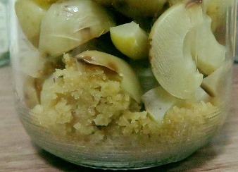 Take a glass jar and add grated jaggery first then the deseeded Gooseberries.