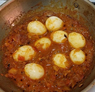 Add boiled Quail eggs to this masala and stir for 1 minute and serve.