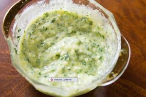 1. Stir together the butter, oil, garlic, and parsley in a small bowl.( I use to grind coarsely in mixer garlic, green chili, cumin seeds finally parsley and butter, mix this mixture with olive oil).